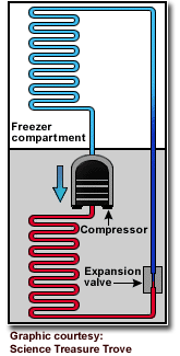 The coils then go through the freezer and regular part of the refrigerator where the colder liquid in the coil pulls the heat out of the compartments. This makes the inside of the freezer and entire refrigerator cold.